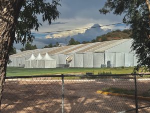 The Unidad Deportiva tent camp, which spans a full-size soccer field and is set up to process large groups.
